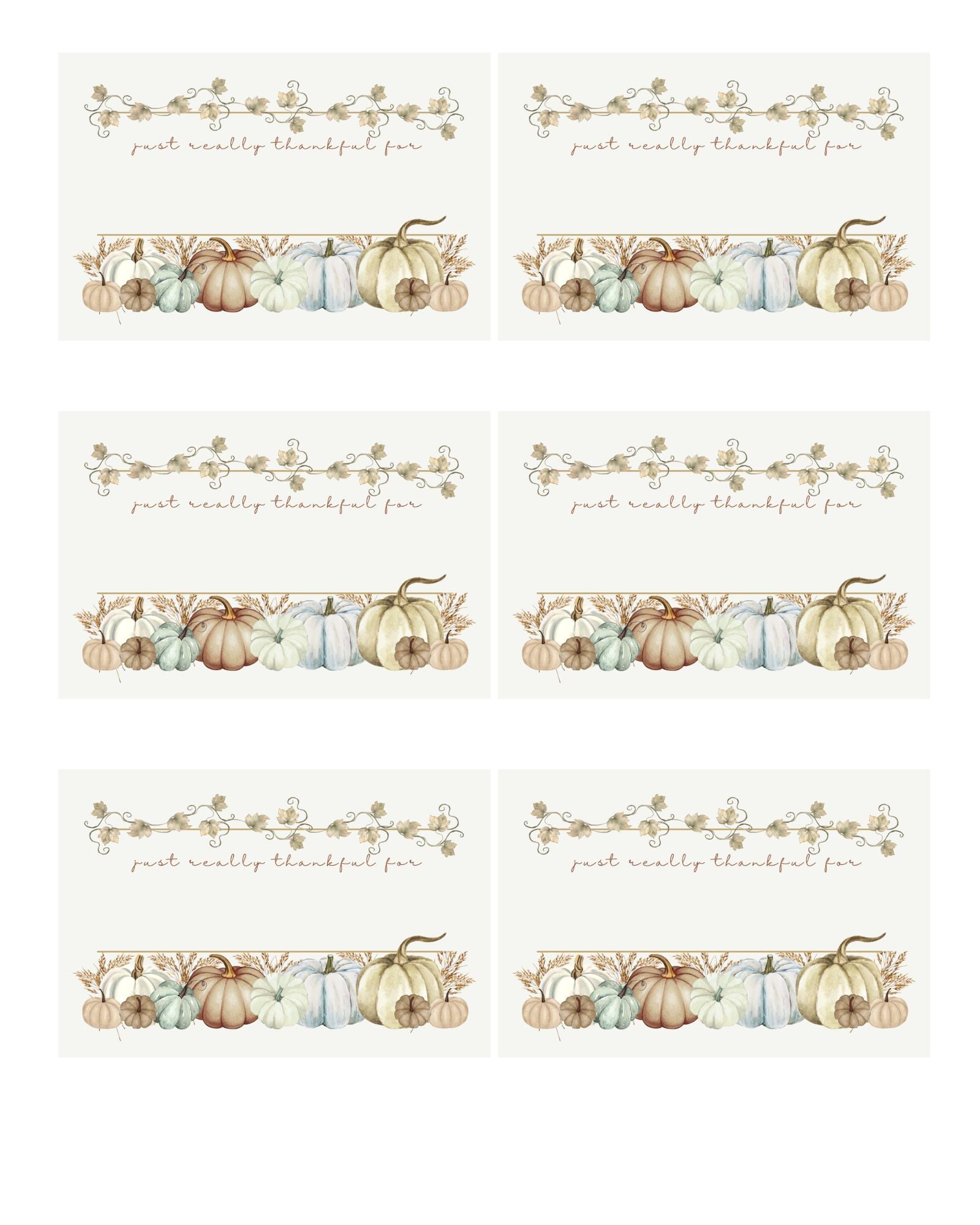 Add a warm, personal touch to your Thanksgiving table with these elegant “Just Really Thankful For” name cards. Featuring soft watercolor pumpkins, neutral autumn tones, and delicate vine accents, each card rests beautifully atop a natural pinecone holder. Perfect for family gatherings or Friendsgiving dinners, these place cards bring both charm and gratitude to your holiday setting.