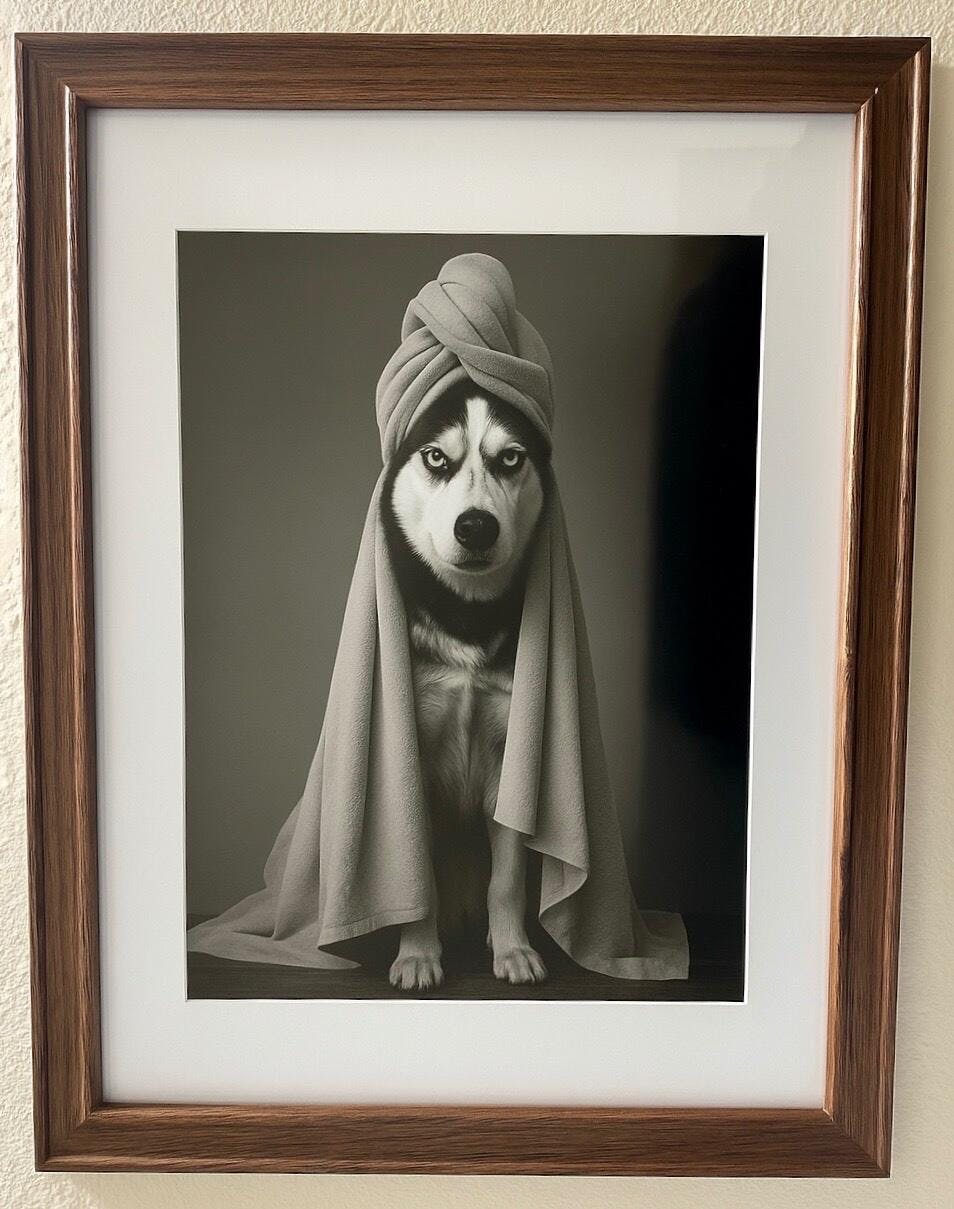 This black-and-white portrait captures the quiet luxury of your pet, mid–self-care moment — wrapped in towels, radiating poise, and unbothered by the chaos of the world. A perfect balance of humor and sophistication, it turns a simple bath day into an artful statement.